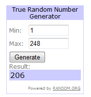 Först vill jag bara säga tack för att så fantastiskt många hittade till min blogcandy, och från hela världen också. Jag har haft jättekul och smygit runt och tittat på era sidor, inte på alla för det har jag faktiskt inte hunnit med men på många. Hela 248 kommentarer fick jag efter jag tagit bort ett par dubbletter. Jag trodde att jag kanske skulle få in 50-100 kommentarer max så det var roligt!