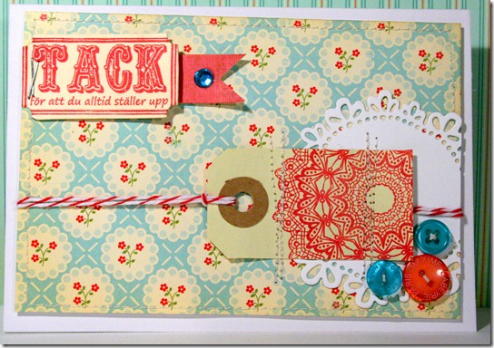 Jag tycker att rött och tukost är så fint ihop. Jag följde färgerna i pappret, det blev ett lite annorlunda kort på något sätt. Jag hade i vart fall roligt medan jag gjorde det.
